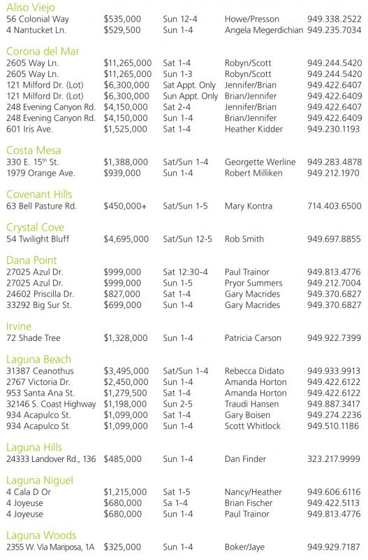 Aliso Viejo 56 Colonial Way $535,000 Sun 12-4 Howe/Presson 949.338.2522 4 Nantucket Ln. $529,500 Sun 1-4 Angela Megerdichian 949.235.7034 Corona del Mar 2605 Way Ln. $11,265,000 Sat 1-4 Robyn/Scott 949.244.5420 2605 Way Ln. $11,265,000 Sun 1-3 Robyn/Scott 949.244.5420 121 Milford Dr. (Lot) $6,300,000 SatAppt. Only Jennifer/Brian 949.422.6407 121 Milford Dr. (Lot) $6,300,000 Sun Appt. Only Brian/Jennifer 949.422.6409 248 Evening Canyon Rd. $4,150,000 Sat 2-4 Jennifer/Brian 949.422.6407 248 Evening Canyon Rd. $4,150,000 Sun 1-4 Brian/Jennifer 949.422.6409 601 Iris Ave. $1,525,000 Sat 1-4 Heather Kidder 949.230.1193 Costa Mesa 330 E. 15 th St. $1,388,000 Sat/Sun 1-4 Georgette Werline 949.283.4878 1979 Orange Ave. $939,000 Sun 1-4 Robert Milliken 949.212.1970 Covenant Hills 63 Bell Pasture Rd. $450,000+ Sat/Sun 1-5 Mary Kontra 714.403.6500 Crystal Cove 54 Twilight Bluff $4,695,000 Sat/Sun 12-5 Rob Smith 949.697.8855 Dana Point 27025 Azul Dr. $999,000 Sat 12:30-4 Paul Trainor 949.813.4776 27025 Azul Dr. $999,000 Sun 1-5 Pryor Summers 949.212.7004 24602 Priscilla Dr. $827,000 Sat 1-4 Gary Macrides 949.370.6827 33292 Big Sur St. $699,000 Sun 1-4 Gary Macrides 949.370.6827 Irvine 72 Shade Tree $1,328,000 Sun 1-4 Patricia Carson 949.922.7399 Laguna Beach 31387 Ceanothus $3,495,000 Sat/Sun 1-4 Rebecca Didato 949.933.9913 2767 Victoria Dr. $2,450,000 Sun 1-4 Amanda Horton 949.422.6122 953 Santa Ana St. $1,279,500 Sat 1-4 Amanda Horton 949.422.6122 32146 S. Coast Highway $1,198,000 Sun 2-5 Traudi Hansen 949.887.3417 934 Acapulco St. $1,099,000 Sat 1-4 Gary Boisen 949.274.2236 934 Acapulco St. $1,099,000 Sun 1-4 Scott Whitlock 949.510.1186 Laguna Hills 24333 Landover Rd.,136 $485,000 Sun 1-4 Dan Finder 323.217.9999 Laguna Niguel 4 Cala D Or $1,215,000 Sat 1-5 Nancy/Heather 949.606.6116 4 Joyeuse $680,000 Sa 1-4 Brian Fischer 949.422.5113 4 Joyeuse $680,000 Sun 1-4 Paul Trainor 949.813.4776 Laguna Woods 2355 W. ViaMariposa, 1A $325,000 Sun 1-4 Boker/Jaye 949.929.7187