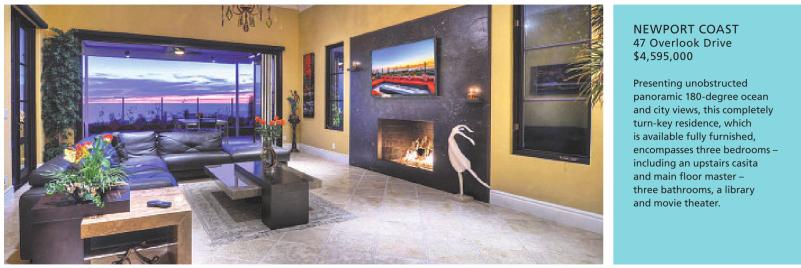 NEWPORT COAST 47 Overlook Drive $4,595,000 Presenting unobstructed panoramic 180-degree ocean and city views, this completely turn-key residence, which is available fully furnished, encompasses three bedrooms – including an upstairs casita and main floor master – three bathrooms, a library and movie theater.