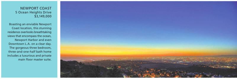NEWPORT COAST 5 Ocean Heights Drive $3,149,000 Boasting an enviable Newport Coast location, this stunning residenceoverlooks breathtaking views that encompass the ocean, Newport Harbor and even Downtown L.A. on a clear day. The gorgeous three bedroom, three-and-one-half bath home includes a luxurious and private main floor master suite.