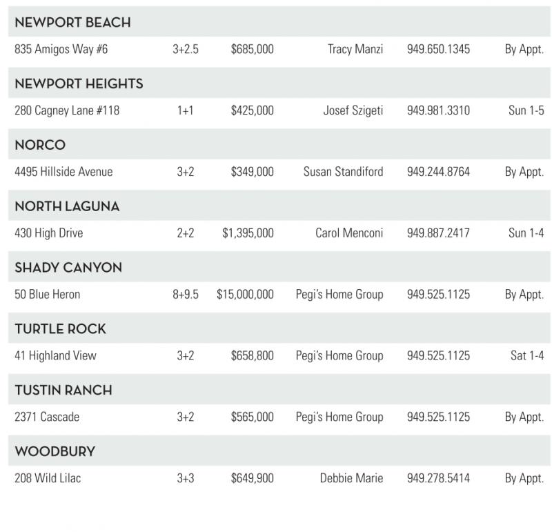NEWPORTBEACH 835 Amigos Way#6 3+2.5 $685,000 Tracy Manzi 949.650.1345 By Appt. NEWPORTHEIGHTS 280 Cagney Lane #118 1+1 $425,000 Josef Szigeti 949.981.3310 Sun 1-5 NORCO 4495 Hillside Avenue 3+2 $349,000 Susan Standiford 949.244.8764 By Appt. NORTH GUNA 430 High Drive 2+2 $1,395,000 Carol Menconi 949.887.2417 Sun 1-4 SHADYCANYON 50 Blue Heron 8+9.5 $15,000,000 Pegi’sHome Group 949.525.1125 By Appt. TURTLE ROCK 41 Highland View 3+2 $658,800 Pegi’sHome Group 949.525.1125 Sat 1-4 TUSTIN RANCH 2371 Cascade 3+2 $565,000 Pegi’sHome Group 949.525.1125 By Appt. WOODBURY 208 Wild Lilac 3+3 $649,900 Debbie Marie 949.278.5414 By Appt. See also