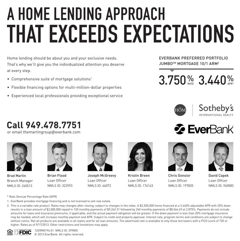 * Rate /Annual Percentage Rate (APR) 1. EverBank provides mortgage financing and is not licensed to sell real estate. 2. This is a variable rate product. Rates may changes after closing, subject to changes in the index. A $2,500,000 home financed at a 3.440% adjustable APR with 20% down results in a loan amount of $2,000,000 repaid in 120 monthly payments of $9,262.31 followed by 240 monthly payments of $8,566.69 at 2.875%. Payments do not include amounts for taxes and insurance premiums, if applicable, and the actual payment obligation will be greater. If the down payment is less than 20% mortgage insurance may be needed, which will increase monthly payment and APR. Subject to credit and property approval. Interest rate, program terms and conditions are subject to change without notice. Not all products are available in all states and for all loan amounts. The advertised rate is available to only those borrowers with a FICO score of 720 or higher. Rates as of 9/17/2013. Other restrictions and limitations may apply.