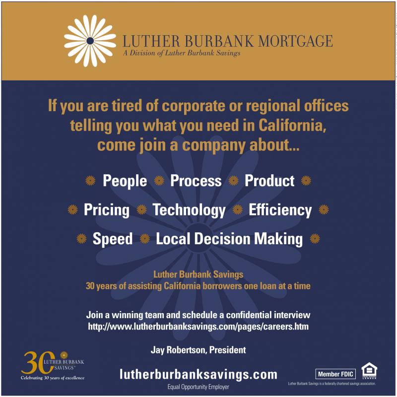65 If you are tired of corporate or regional offices telling you what you need in California, come join a company about... People Process Product Pricing Technology Efficiency Speed Local Decision Making Luther Burbank Savings 30 years of assisting California borrowers one loan at a time Join a winning team and schedule a confidential interview http://www.lutherburbanksavings.com/pages/careers.htm Jay Robertson, President Celebrating 30 years of excellence lutherburbanksavings.com Equal Opportunity Employer Member FDIC Luther Burbank Savings is afederally chartered savings association.