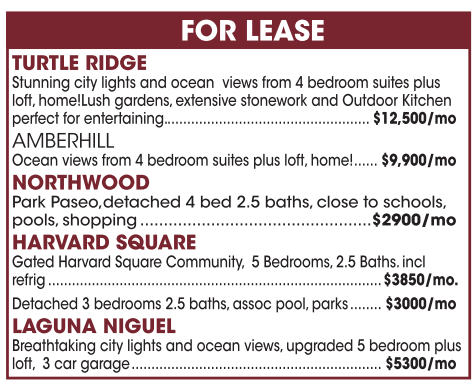TURTLE RIDGE FOR LEASE Stunning city lights and ocean views from 4bedroom suites plus loft, home!Lush gardens,extensive stonework and Outdoor Kitchen perfect for entertaining.................................................... $12,500/mo AMBERHILL Ocean views from 4bedroom suites plus loft, home!...... $9,900/mo NORTHWOOD Park Paseo,detached 4bed 2.5 baths,close to schools, pools,shopping .................................................$2900/mo HARVARD SQUARE Gated Harvard Square Community, 5Bedrooms,2.5 Baths.incl refrig .................................................................................... $3850/mo. Detached 3bedrooms 2.5 baths,assoc pool, parks........ $3000/mo LAGUNA NIGUEL Breathtaking city lights and ocean views,upgraded 5bedroom plus loft, 3car garage............................................................... $5300/mo