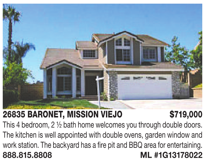 26835 BARONET, MISSION VIEJO $719,000 This 4bedroom,2½bathhome welcomesyou through doubledoors.