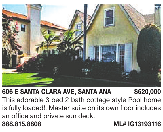 606 E SANTA CLARA AVE, SANTA ANA $620,000 This adorable 3 bed 2 bath cottage style Pool home