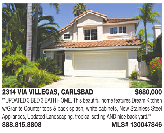 2314 VIA VILLEGAS, CARLSBAD $680,000 **UPDATED 3BED 3BATHHOME. This beautiful home features Dream Kitchen w/Granite Counter tops & back splash, white cabinets, New Stainless Steel Appliances, Updated Landscaping, tropical setting AND nice back yard.** 888.815.8808 MLS# 130047846