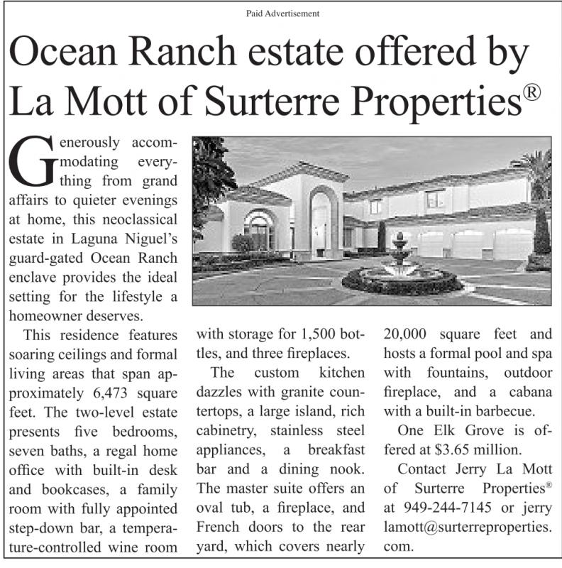 Generously accommodating everything from grand affairs to quieter evenings at home, this neoclassical estate in Laguna Niguel’s guard-gated Ocean Ranch enclave provides the ideal setting for the lifestyle a homeowner deserves. This residence features soaring ceilings and formal living areas that span approximately 6,473 square feet. The two-level estate presents five bedrooms, seven baths, a regal home office with built-in desk and bookcases, a family room with fully appointed step-down bar, a temperature-controlled wine room with storage for 1,500 bottles, and three fireplaces. The custom kitchen dazzles with granite countertops, a large island, rich cabinetry, stainless steel appliances, a breakfast bar and a dining nook. The master suite offers an oval tub, a fireplace, and French doors to the rear yard, which covers nearly Paid Advertisement Ocean Ranch estate offered by La Mott of Surterre Properties ® 20,000 square feet and hosts a formal pool and spa with fountains, outdoor fireplace, and a cabana with a built-in barbecue. One Elk Grove is offered at $3.65 million. Contact Jerry La Mott of Surterre Properties ® at 949-244-7145 or jerry lamott@surterreproperties. com.