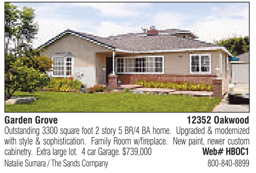 Garden Grove 12352 Oakwood Outstanding 3300 squarefoot 2story 5BR/4 BA home. Upgraded &modernized with style &sophistication. Family Room w/fireplace. New paint, newer custom cabinetry. Extra large lot. 4car Garage. $739,000 Web# HBOC1 Natalie Sumara /The Sands Company 800-840-8899
