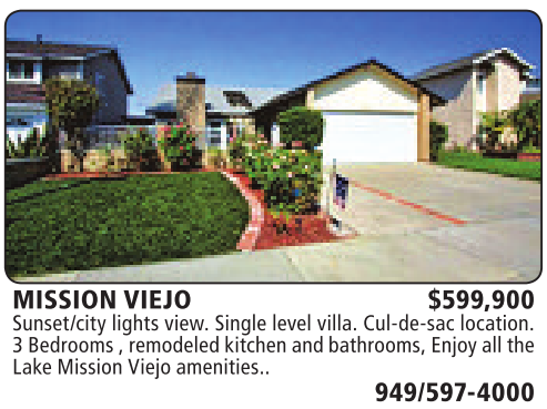 MISSION VIEJO $599,900 Sunset/city lights view. Single level villa. Cul-de-sac location. 3Bedrooms,remodeledkitchen andbathrooms,Enjoy allthe Lake MissionViejo amenities..