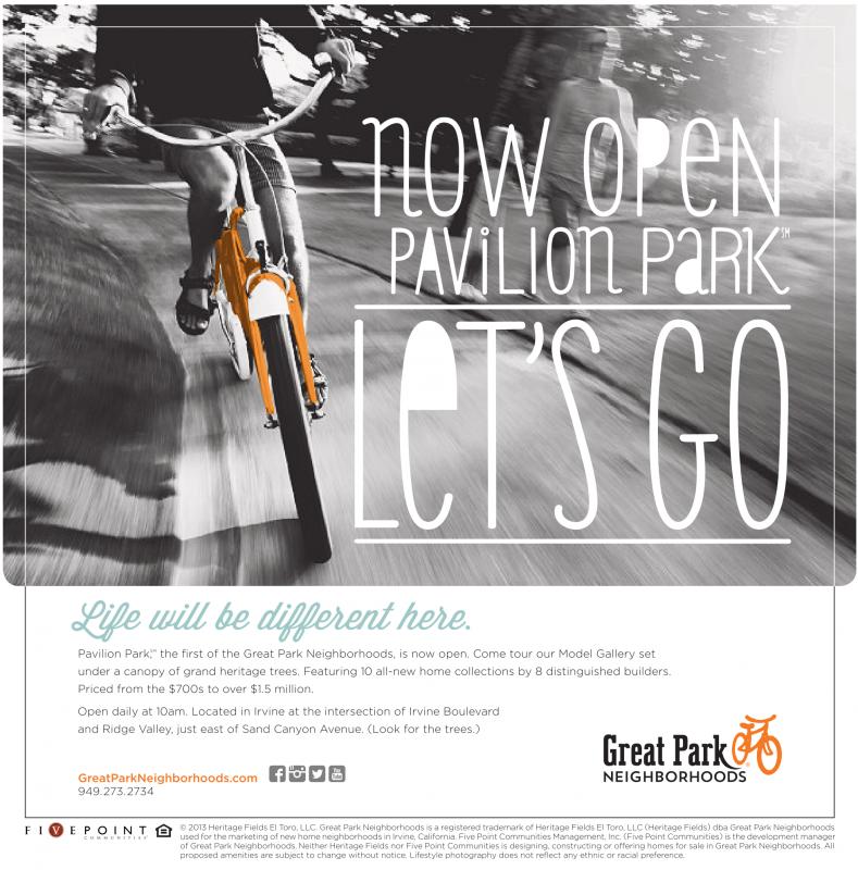 ©2013 Heritage Fields El Toro, LLC. Great Park Neighborhoods is aregistered trademark of Heritage Fields El Toro, LLC (Heritage Fields) dba Great Park Neighborhoods used forthe marketing of newhome neighborhoods in Irvine,California. FivePoint Communities Management, Inc. (FivePoint Communities) is the development manager of Great Park Neighborhoods. Neither Heritage Fields nor Five Point Communities is designing, constructing or offering homes for sale in Great Park Neighborhoods. All proposed amenities are subject to change without notice. Lifestyle photography does not reflect any ethnic or racial preference.