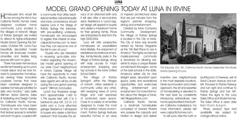 “Guests who are interested in receiving up-to-date information regarding the november model grand opening of our Jade Court neighborhood in Irvine’s Cypress Village will have the opportunity to meet with California Pacific Homes’ sales agents who will be on-site during the Luna grand opening event,” Stillman concluded.