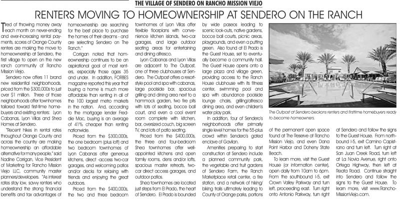 “Recent hikes in rental rates throughout Orange County and across the country are making homeownership an affordable alternative for many people,” said nadine Corrigan, vice President of Marketing for Rancho Mission viejo LLC, community master planners/developers. “As interest rates stay low, savvy renters who understand the strong financial 14 benefits and tax advantages of