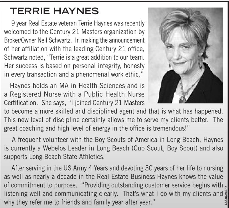 9 year Real Estate veteran Terrie Haynes was recently welcomed to the Century 21 Masters organization by Broker/Owner Neil Schwartz. In making the announcement of her affiliation with the leading Century 21 office, Schwartz noted, “Terrie is a great addition to our team. Her success is based on personal integrity, honesty in every transaction and a phenomenal work ethic.”