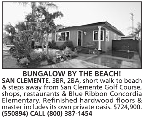 BUNGALOW BY THE BEACH! SAN CLEMENTE. 3BR, 2BA, short walk to beach & steps away from San Clemente Golf Course, shops, restaurants & Blue Ribbon Concordia Elementary. Refinished hardwood floors &master includes its own private oasis. $724,900. (550894) CALL (800) 387-1454