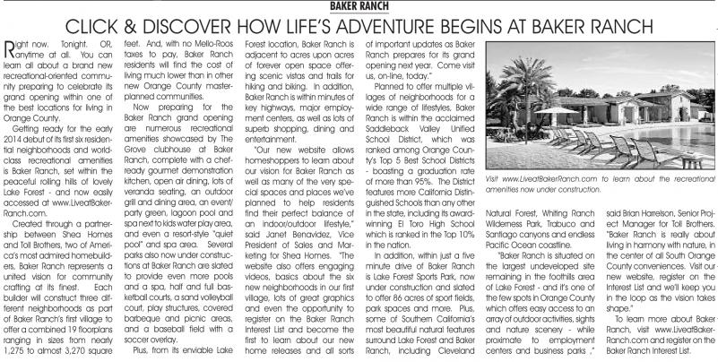 Getting ready for the early 2014 debut of its first six residential neighborhoods and worldclass recreational amenities is Baker Ranch, set within the peaceful rolling hills of lovely Lake Forest - and now easily accessed at www.LiveatBaker- Ranch.com.