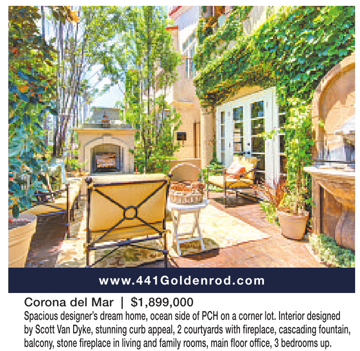 www.441Goldenrod.com Corona del Mar | $1,899,000 Spacious designer’s dream home, ocean side of PCH on acorner lot. Interior designed by Scott Van Dyke, stunning curb appeal, 2courtyards with fireplace, cascading fountain, balcony, stone fireplace in living and family rooms, main floor office, 3bedrooms up.