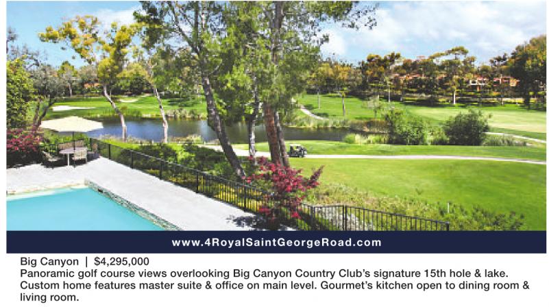 Big Canyon | $4,295,000 Panoramic golf course views overlooking Big Canyon Country Club’s signature 15th hole & lake. Custom home features master suite & office on main level. Gourmet’s kitchen open to dining room & living room.