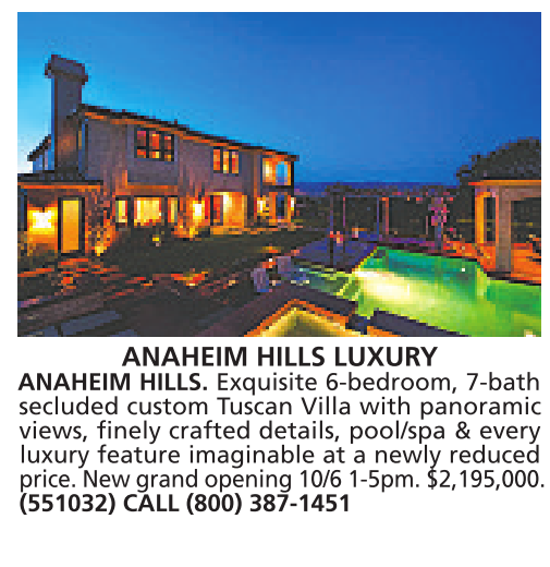 ANAHEIM HILLS LUXURY ANAHEIM HILLS. Exquisite 6-bedroom, 7-bath secluded custom Tuscan Villa with panoramic views, finely crafted details, pool/spa & every luxury feature imaginable at a newly reduced price. New grand opening 10/6 1-5pm. $2,195,000. (551032) CALL (800) 387-1451