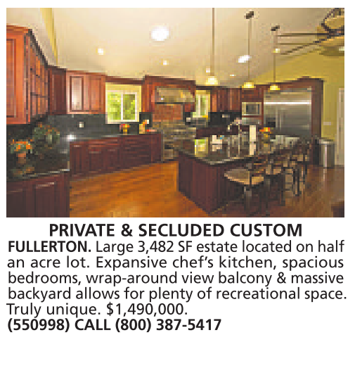 PRIVATE & SECLUDED CUSTOM FULLERTON. Large 3,482 SF estate located on half an acre lot. Expansive chef’s kitchen, spacious bedrooms, wrap-around view balcony &massive backyard allows forplenty of recreational space. Truly unique. $1,490,000. (550998) CALL (800) 387-5417