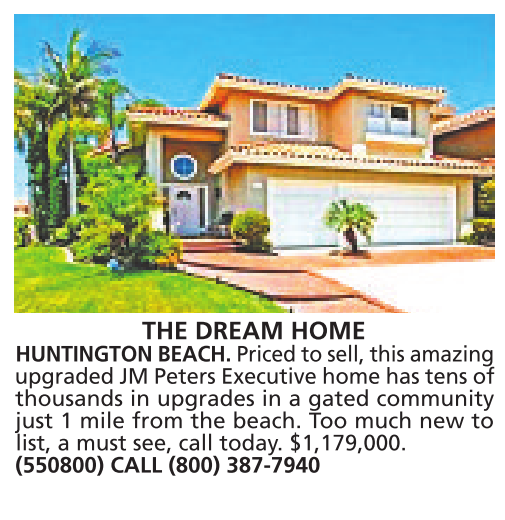 room, grounds. pool. THE DREAM HOME HUNTINGTON BEACH. Priced to sell, this amazing upgraded JM Peters Executive home has tens of thousands in upgrades in a gated community just 1 mile from the beach. Too much new to list, a must see, call today. $1,179,000. (550800) CALL (800) 387-7940