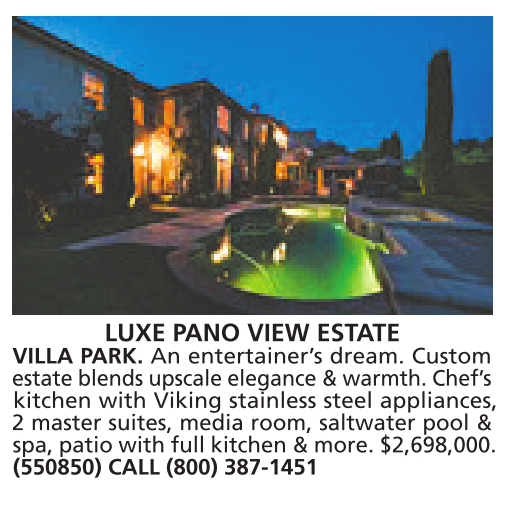 LUXE PANO VIEW ESTATE VILLA PARK. An entertainer’s dream. Custom estate blends upscale elegance &warmth. Chef’s kitchen with Viking stainless steel appliances, 2 master suites, media room, saltwater pool & spa,patio with full kitchen &more. $2,698,000. (550850) CALL (800) 387-1451