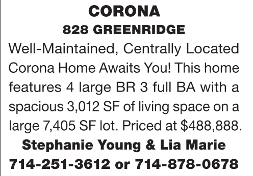 CORONA 828 GREENRIDGE Well-Maintained, Centrally Located Corona Home Awaits You! This home features 4 large BR 3 full BA with a spacious 3,012 SF of living space on a large 7,405 SF lot. Priced at $488,888. Stephanie Young & Lia Marie 714-251-3612 or 714-878-0678 See also