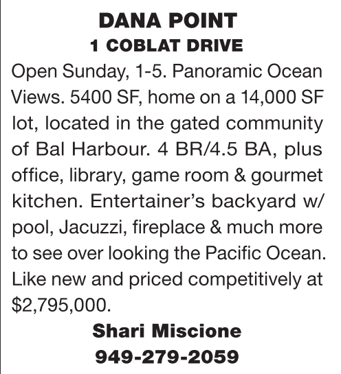 DANA POINT 1 COBLAT DRIVE Open Sunday, 1-5. Panoramic Ocean Views. 5400 SF, home on a 14,000 SF lot, located in the gated community of Bal Harbour. 4 BR/4.5 BA, plus office, library, game room & gourmet kitchen. Entertainer’s backyard w/ pool, Jacuzzi, fireplace & much more to see over looking the Pacific Ocean. Like new and priced competitively at $2,795,000.