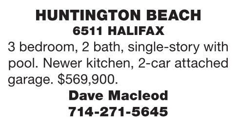 HUNTINGTON BEACH 6511 HALIFAX 3 bedroom, 2 bath, single-story with pool. Newer kitchen, 2-car attached garage. $569,900.