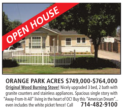 ORANGE PARK ACRES $749,000-$764,000 Original Wood BurningStove! Nicelyupgraded 3bed,2bathwith granite counters and stainless appliances. Spacious single story with “Away-From-It-All” living in theheartofOC! Buythis “AmericanDream”... even includes thewhite picket fence! Call 714-482-9100