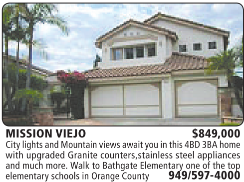MISSION VIEJO $849,000 City lights andMountain viewsawaityou in this 4BD3BA home with upgraded Granite counters,stainless steel appliances and much more. Walk to Bathgate Elementary one of the top elementary schools in Orange County 949/597-4000