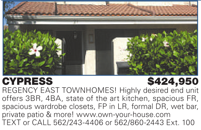 CYPRESS $424,950 REGENCY EAST TOWNHOMES! Highly desired end unit offers 3BR, 4BA, state of the art kitchen, spacious FR, spacious wardrobe closets, FP in LR, formal DR, wet bar, private patio & more! www.own-your-house.com TEXT or CALL 562/243-4406 or 562/860-2443 Ext. 100