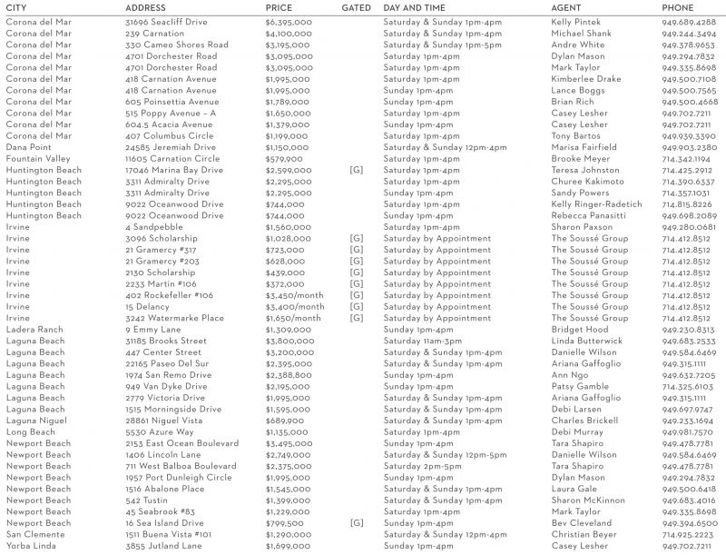 CITY ADDRESS PRICE GATED DAY AND TIME AGENT PHONE Corona del Mar 31696 Seacliff Drive $6,395,000 Saturday & Sunday 1pm-4pm Kelly Pintek 949.689.4288 Corona del Mar 239 Carnation $4,100,000 Saturday & Sunday 1pm-4pm Michael Shank 949.244.3494 Corona del Mar 330 Cameo Shores Road $3,195,000 Saturday & Sunday 1pm-5pm Andre White 949.378.9653 Corona del Mar 4701 Dorchester Road $3,095,000 Saturday 1pm-4pm Dylan Mason 949.294.7832 Corona del Mar 4701 Dorchester Road $3,095,000 Saturday 1pm-4pm Mark Taylor 949.335.8698 Corona del Mar 418 Carnation Avenue $1,995,000 Saturday 1pm-4pm Kimberlee Drake 949.500.7108 Corona del Mar 418 Carnation Avenue $1,995,000 Sunday 1pm-4pm Lance Boggs 949.500.7565 Corona del Mar 605 Poinsettia Avenue $1,789,000 Sunday 1pm-4pm Brian Rich 949.500.4668 Corona del Mar 515 Poppy Avenue – A $1,650,000 Saturday 1pm-4pm Casey Lesher 949.702.7211 Corona del Mar 604.5 Acacia Avenue $1,379,000 Sunday 1pm-4pm Casey Lesher 949.702.7211 Corona del Mar 407 Columbus Circle $1,199,000 Saturday 1pm-4pm Tony Bartos 949.939.3390 Dana Point 24585 Jeremiah Drive $1,150,000 Saturday & Sunday 12pm-4pm Marisa Fairfield 949.903.2380 Fountain Valley 11605 Carnation Circle $579,900 Saturday 1pm-4pm Brooke Meyer 714.342.1194 Huntington Beach 17046 Marina Bay Drive $2,599,000 [G] Saturday 1pm-4pm Teresa Johnston 714.425.2912 Huntington Beach 3311 Admiralty Drive $2,295,000 Saturday 1pm-4pm Churee Kakimoto 714.390.6337 Huntington Beach 3311 Admiralty Drive $2,295,000 Sunday 1pm-4pm Sandy Powers 714.357.1031 Huntington Beach 9022 Oceanwood Drive $744,000 Saturday 1pm-4pm Kelly Ringer-Radetich 714.815.8226 Huntington Beach 9022 Oceanwood Drive $744,000 Sunday 1pm-4pm Rebecca Panasitti 949.698.2089 Irvine 4 Sandpebble $1,560,000 Saturday 1pm-4pm Sharon Paxson 949.280.0681 Irvine 3096 Scholarship $1,028,000 [G] Saturday by Appointment The Soussé Group 714.412.8512 Irvine 21 Gramercy #317 $723,000 [G] Saturday by Appointment The Soussé Group 714.412.8512 Irvine 21 Gramercy #203 $628,000 [G] Saturday by Appointment The Soussé Group 714.412.8512 Irvine 2130 Scholarship $439,000 [G] Saturday by Appointment The Soussé Group 714.412.8512 Irvine 2233 Martin #106 $372,000 [G] Saturday by Appointment The Soussé Group 714.412.8512 Irvine 402 Rockefeller #106 $3,450/month [G] Saturday by Appointment The Soussé Group 714.412.8512 Irvine 15 Delancy $3,400/month [G] Saturday by Appointment The Soussé Group 714.412.8512 Irvine 3242 Watermarke Place $1,650/month [G] Saturday by Appointment The Soussé Group 714.412.8512 Ladera Ranch 9 Emmy Lane $1,309,000 Sunday 1pm-4pm Bridget Hood 949.230.8313 Laguna Beach 31185 Brooks Street $3,800,000 Saturday 11am-3pm Linda Butterwick 949.683.2533 Laguna Beach 447 Center Street $3,200,000 Saturday & Sunday 1pm-4pm Danielle Wilson 949.584.6469 Laguna Beach 22165 Paseo Del Sur $2,395,000 Saturday & Sunday 1pm-4pm Ariana Gaffoglio 949.315.1111 Laguna Beach 1974 San Remo Drive $2,388,800 Sunday 1pm-4pm Ann Ngo 949.632.7205 Laguna Beach 949 Van Dyke Drive $2,195,000 Sunday 1pm-4pm Patsy Gamble 714.325.6103 Laguna Beach 2779 Victoria Drive $1,995,000 Saturday & Sunday 1pm-4pm Ariana Gaffoglio 949.315.1111 Laguna Beach 1515 Morningside Drive $1,595,000 Saturday & Sunday 1pm-4pm Debi Larsen 949.697.9747 Laguna Niguel 28861 Niguel Vista $689,900 Saturday & Sunday 1pm-4pm Charles Brickell 949.233.1694 Long Beach 5530 Azure Way $1,135,000 Saturday 1pm-4pm Debi Murray 949.981.7570 Newport Beach 2153 East Ocean Boulevard $3,495,000 Sunday 1pm-4pm Tara Shapiro 949.478.7781 Newport Beach 1406 Lincoln Lane $2,749,000 Saturday & Sunday 12pm-5pm Danielle Wilson 949.584.6469 Newport Beach 711 West Balboa Boulevard $2,375,000 Saturday 2pm-5pm Tara Shapiro 949.478.7781 Newport Beach 1957 Port Dunleigh Circle $1,995,000 Sunday 1pm-4pm Dylan Mason 949.294.7832 Newport Beach 1516 Abalone Place $1,545,000 Saturday & Sunday 1pm-4pm Laura Gale 949.500.6418 Newport Beach 542 Tustin $1,399,000 Saturday & Sunday 1pm-4pm Sharon McKinnon 949.683.4016 Newport Beach 45 Seabrook #83 $1,229,000 Saturday 1pm-4pm Mark Taylor 949.335.8698 Newport Beach 16 Sea Island Drive $799,500 [G] Sunday 1pm-4pm Bev Cleveland 949.394.6500 San Clemente 1511 Buena Vista #101 $1,290,000 Saturday & Sunday 12pm-4pm Christian Beyer 714.925.2223 Yorba Linda 3855 Jutland Lane $1,699,000 Sunday 1pm-4pm Casey Lesher 949.702.7211