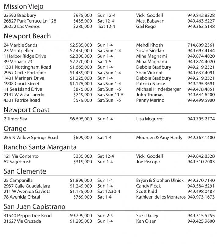 24 Marble Sands $2,585,000 Sun 1-4 Mehdi Khosh 714.609.2361 23 Montpellier $2,450,000 Sat/Sun 1-4 Susan Sinclair 949.697.4144 1Harbor Ridge Drive $2,300,000 Sun 1-4 Mina Maghami 949.874.4020 39 Monaco23 $2,270,000 Sat 1-5 Mina Maghami 949.874.4020 1301 Nottingham Road $1,665,000 Sun 1-4 Debbie Bradbury 949.219.2521 2957 CortePortofino $1,439,000 Sat/Sun 1-4 Shan Vincent 949.637.4091 1401 Mariners Drive $1,225,000 Sun 1-4 Debbie Bradbury 949.219.2521 1908 CourtStreet $1,175,000 Sat/Sun 1-4 Patricia Nance 949.295.3691 11 SeaIsland Drive $875,000 Sat/Sun 1-5 Michael Hinderberger 949.478.4851 2147 WVista Laredo $749,900 Sat/Sun 11-5 John Thomas 949.644.6200 4301 PatriceRoad $579,000 Sat/Sun 1-5 PennyMarino 949.499.5900