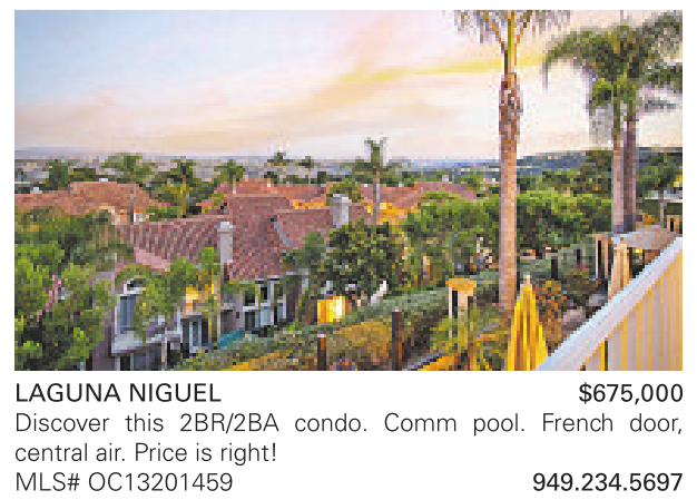LAGUNA NIGUEL $675,000 Discover this 2BR/2BA condo. Comm pool. French door, central air. Price is right! MLS# OC13201459 949.234.5697