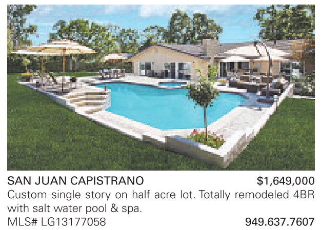 SAN JUAN CAPISTRANO $1,649,000 Custom single story on half acre lot. Totally remodeled 4BR with salt water pool & spa. MLS# LG13177058 949.637.7607