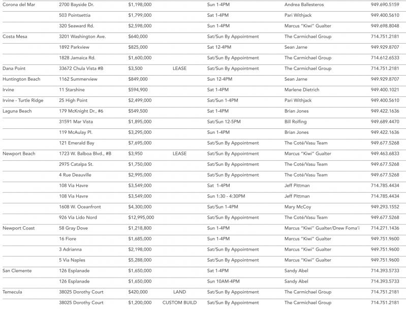 320 Seaward Rd. $2,598,000 Sun 1-4PM Marcus “Kiwi” Gualter 949.698.8048 Costa Mesa 3201 Washington Ave. $640,000 Sat/Sun By Appointment The Carmichael Group 714.751.2181 1892 Parkview $825,000 Sat 12-4PM Sean Jarne 949.929.8707 1828 Jamaica Rd. $1,600,000 Sat/Sun By Appointment The Carmichael Group 714.612.6533 Dana Point 33672 Chula Vista #B $3,500 LEASE Sat/Sun By Appointment The Carmichael Group 714.751.2181 Huntington Beach 1162 Summerview $849,000 Sun 12-4PM Sean Jarne 949.929.8707 Irvine 11 Starshine $594,900 Sat 1-4PM Marlene Dietrich 949.400.1021 Irvine - Turtle Ridge 25 High Point $2,499,000 Sat/Sun 1-4PM Pari Withjack 949.400.5610 Laguna Beach 179 McKnight Dr., #6 $549,500 Sat 1-4PM Brian Jones 949.422.1636 31591 Mar Vista $1,895,000 Sat/Sun 12-5PM Bill Rolfing 949.689.4470 119 McAulay Pl. $3,295,000 Sun 1-4PM Brian Jones 949.422.1636 121 Emerald Bay $7,695,000 Sat/Sun By Appointment The Coté/Vasu Team 949.677.5268 Newport Beach 1723 W. Balboa Blvd., #B $3,950 LEASE Sat/Sun By Appointment Marcus “Kiwi” Gualter 949.463.6833 2975 Catalpa St. $1,750,000 Sat/Sun By Appointment The Coté/Vasu Team 949.677.5268 4 Rue Deauville $2,995,000 Sat/Sun By Appointment The Coté/Vasu Team 949.677.5268 108 Via Havre $3,549,000 Sat 1-4PM Jeff Pittman 714.785.4434 108 Via Havre $3,549,000 Sun 1:30 - 4:30PM Jeff Pittman 714.785.4434 1608 W. Oceanfront $4,300,000 Sat/Sun 1-4PM Mary McCoy 949.293.1552 926 Via Lido Nord $12,995,000 Sat/Sun By Appointment The Coté/Vasu Team 949.677.5268 Newport Coast 58 Gray Dove $1,218,800 Sun 1-4PM Marcus “Kiwi” Gualter/Drew Foma’i 714.271.1436 16 Fiore $1,685,000 Sun 1-4PM Marcus “Kiwi” Gualter 949.751.9600 3 Adrianna $2,198,000 Sat/Sun By Appointment Marcus “Kiwi” Gualter 949.751.9600 5 Via Naples $5,288,000 Sat/Sun By Appointment Marcus “Kiwi” Gualter 949.751.9600 San Clemente 126 Esplanade $1,650,000 Sat 1-4PM Sandy Abel 714.393.5733 126 Esplanade $1,650,000 Sun 10AM-4PM Sandy Abel 714.393.5733 Temecula 38025 Dorothy Court $420,000 LAND Sat/Sun By Appointment The Carmichael Group 714.751.2181 38025 Dorothy Court $1,200,000 CUSTOM BUILD Sat/Sun By Appointment The Carmichael Group 714.751.2181