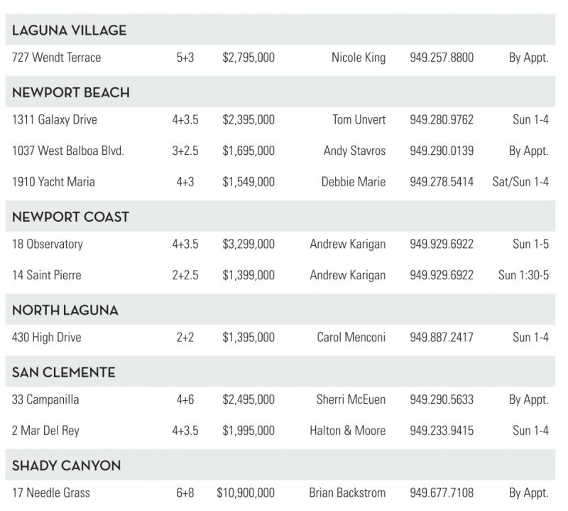 727 Wendt Terrace 5+3 $2,795,000 Nicole King 949.257.8800 By Appt. NEWPORTBEACH 1311 Galaxy Drive 4+3.5 $2,395,000 TomUnvert 949.280.9762 Sun 1-4 1037 West Balboa Blvd. 3+2.5 $1,695,000 Andy Stavros 949.290.0139 By Appt. 1910 Yacht Maria 4+3 $1,549,000 Debbie Marie 949.278.5414 Sat/Sun 1-4 NEWPORTCOAST 18 Observatory 4+3.5 $3,299,000 Andrew Karigan 949.929.6922 Sun 1-5 14 Saint Pierre 2+2.5 $1,399,000 Andrew Karigan 949.929.6922 Sun 1:30-5 NORTH GUNA 430 High Drive 2+2 $1,395,000 Carol Menconi 949.887.2417 Sun 1-4 SANCLEMENTE 33 Campanilla 4+6 $2,495,000 Sherri McEuen 949.290.5633 By Appt. 2Mar Del Rey 4+3.5 $1,995,000 Halton &Moore 949.233.9415 Sun 1-4 SHADYCANYON 17 Needle Grass 6+8 $10,900,000 Brian Backstrom 949.677.7108 By Appt.