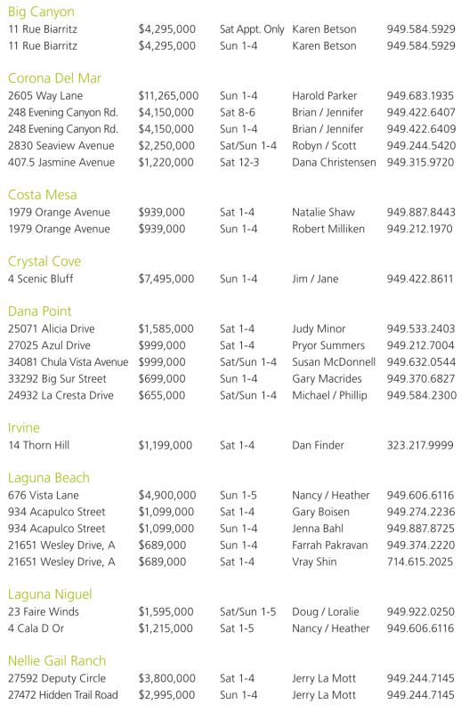 Big Canyon 11 Rue Biarritz $4,295,000 SatAppt. Only Karen Betson 949.584.5929 11 Rue Biarritz $4,295,000 Sun 1-4 Karen Betson 949.584.5929 Corona Del Mar 2605 Way Lane $11,265,000 Sun 1-4 Harold Parker 949.683.1935 248Evening Canyon Rd. $4,150,000 Sat 8-6 Brian / Jennifer 949.422.6407 248Evening Canyon Rd. $4,150,000 Sun 1-4 Brian / Jennifer 949.422.6409 2830 Seaview Avenue $2,250,000 Sat/Sun 1-4 Robyn / Scott 949.244.5420 407.5 Jasmine Avenue $1,220,000 Sat 12-3 Dana Christensen 949.315.9720 Costa Mesa 1979 Orange Avenue $939,000 Sat 1-4 Natalie Shaw 949.887.8443 1979 Orange Avenue $939,000 Sun 1-4 Robert Milliken 949.212.1970