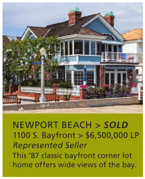 NEWPORT BEACH > SOLD 1100 S. Bayfront > $6,500,000 LP Represented Seller This ‘87 classic bayfront corner lot home offers wide views of the bay.