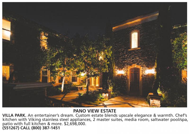 PANO VIEW ESTATE VILLA PARK. An entertainer’s dream. Custom estate blends upscale elegance & warmth. Chef’s kitchen with Viking stainless steel appliances, 2 master suites, media room, saltwater pool/spa, patio with full kitchen & more. $2,698,000. (551267) CALL (800) 387-1451
