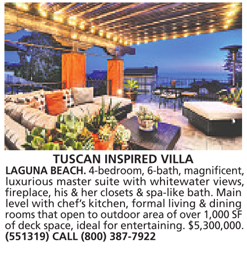 TUSCAN INSPIRED VILLA LAGUNA BEACH. 4-bedroom, 6-bath, magnificent, luxurious master suite with whitewater views, fireplace, his &her closets &spa-like bath. Main level with chef’skitchen, formal living &dining rooms that open to outdoor area of over 1,000 SF of deck space, ideal for entertaining. $5,300,000. (551319) CALL (800) 387-7922