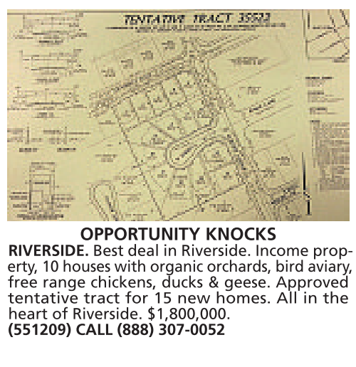 tentative tract for 15 new homes. All in the heart of Riverside. $1,800,000. (551209) CALL (888) 307-0052