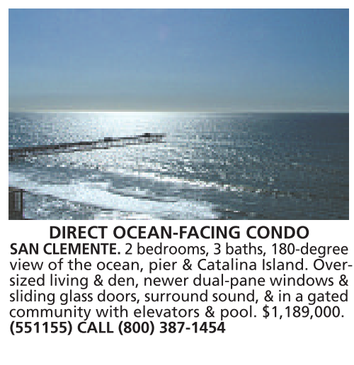 DIRECT OCEAN-FACING CONDO SAN CLEMENTE. 2bedrooms, 3baths, 180-degree view of the ocean, pier & Catalina Island. Oversized living &den, newer dual-pane windows & sliding glass doors, surround sound, &inagated community with elevators & pool. $1,189,000. (551155) CALL (800) 387-1454