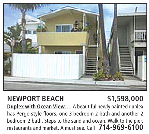 DuplexwithOcean View…. Abeautifulnewly painted duplex has Pergo style floors, one 3bedroom 2bath and another 2 bedroom2bath. Stepstothe sand andocean. Walk to thepier, restaurantsand market.Amust see. Call 714-969-6100
