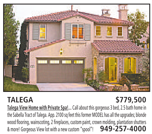 Call TALEGA $779,500 Talega View HomewithPrivate Spa!... Call about this gorgeous 3bed, 2.5bathhome in theSabella TractofTalega. App. 2100 sq feet this former MODELhas allthe upgrades;blonde wood flooring,wainscoting, 2fireplaces, custompaint, crown molding,plantationshutters &more!Gorgeous View lotwithanew custom“spool”! 949-257-4000
