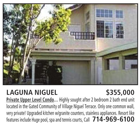 LAGUNA NIGUEL $355,000 Private Upper Level Condo… Highly sought after 2bedroom 2bath end unit located inthe Gated Community ofVillage Niguel Terrace. Only one common wall, very private! Upgraded kitchen w/granite counters, stainless appliances. Resort like featuresinclude Hugepool, spaand tennis courts, Call 714-969-6100
