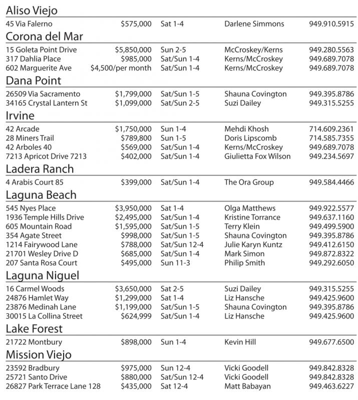 42 Arcade $1,750,000 Sun 1-4 Mehdi Khosh 714.609.2361 28 Miners Trail $789,800 Sun 1-5 Doris Lipscomb 714.585.7355 42 Arboles 40 $569,000 Sat/Sun 1-4 Kerns/McCroskey 949.689.7078 7213 Apricot Drive7213 $402,000 Sat/Sun 1-4 Giulietta FoxWilson 949.234.5697 Ladera Ranch 4Arabis Court85 $399,000 Sat/Sun 1-4 TheOra Group 949.584.4466 Laguna Beach 545 Nyes Place $3,950,000 Sat 1-4 Olga Matthews 949.922.5577 1936 Temple Hills Drive $2,495,000 Sat/Sun 1-4 Kristine Torrance 949.637.1160 605 Mountain Road $1,595,000 Sat/Sun 1-5 TerryKlein 949.499.5900 354 AgateStreet $998,000 Sat/Sun 1-5 Shauna Covington 949.395.8786 1214 Fairywood Lane $788,000 Sat/Sun 12-4 Julie KarynKuntz 949.412.6150 21701 Wesley DriveD $685,000 Sat/Sun 1-4 Mark Simon 949.872.8322 207 Santa Rosa Court $495,000 Sun 11-3 Philip Smith 949.292.6050 Laguna Niguel 16 Carmel Woods $3,650,000 Sat 2-5 Suzi Dailey 949.315.5255 24876 Hamlet Way $1,299,000 Sat 1-4 Liz Hansche 949.425.9600 23876 Medinah Lane $1,199,000 Sat/Sun 1-5 Shauna Covington 949.395.8786 30015 La Collina Street $624,999 Sat/Sun 1-4 Liz Hansche 949.425.9600 Lake Forest 21722 Montbury $898,000 Sun 1-4 Kevin Hill 949.677.6500 Mission Viejo 23592 Bradbury $975,000 Sun 12-4 VickiGoodell 949.842.8328 25721 SantoDrive $880,000 Sat/Sun 12-4 VickiGoodell 949.842.8328 26827 Park TerraceLane 128 $435,000 Sat 12-4 Matt Babayan 949.463.6227