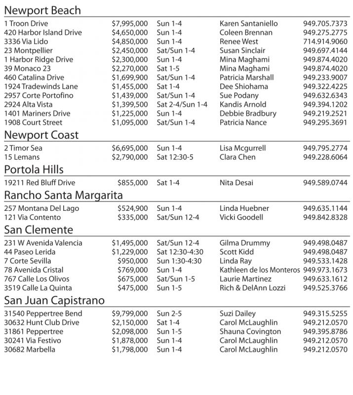 1Troon Drive $7,995,000 Sun 1-4 KarenSantaniello 949.705.7373 420 Harbor Island Drive $4,650,000 Sun 1-4 Coleen Brennan 949.275.2775 3336 ViaLido $4,850,000 Sun 1-4 Renee West 714.914.9060 23 Montpellier $2,450,000 Sat/Sun 1-4 Susan Sinclair 949.697.4144 1Harbor Ridge Drive $2,300,000 Sun 1-4 Mina Maghami 949.874.4020 39 Monaco23 $2,270,000 Sat 1-5 Mina Maghami 949.874.4020 460 Catalina Drive $1,699,900 Sat/Sun 1-4 Patricia Marshall 949.233.9007 1924 Tradewinds Lane $1,455,000 Sat 1-4 Dee Shiohama 949.322.4225 2957 CortePortofino $1,439,000 Sat/Sun 1-4 Sue Podany 949.632.6343 2924 Alta Vista $1,399,500 Sat 2-4/Sun 1-4 Kandis Arnold 949.394.1202 1401 Mariners Drive $1,225,000 Sun 1-4 Debbie Bradbury 949.219.2521 1908 CourtStreet $1,095,000 Sat/Sun 1-4 Patricia Nance 949.295.3691