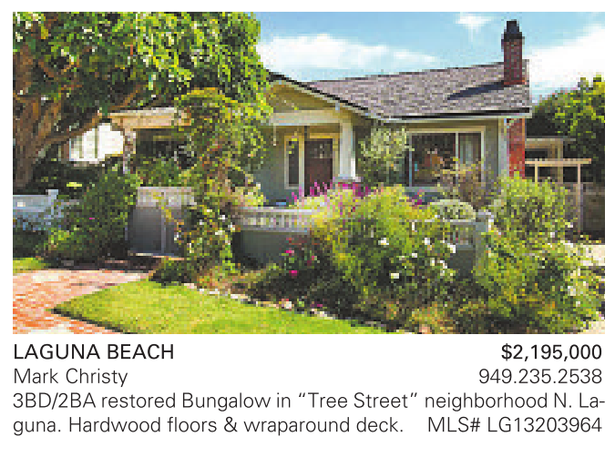LAGUNA BEACH $2,195,000 Mark Christy 949.235.2538 3BD/2BA restored Bungalow in “Tree Street” neighborhood N. Laguna. Hardwood floors & wraparound deck. MLS# LG13203964
