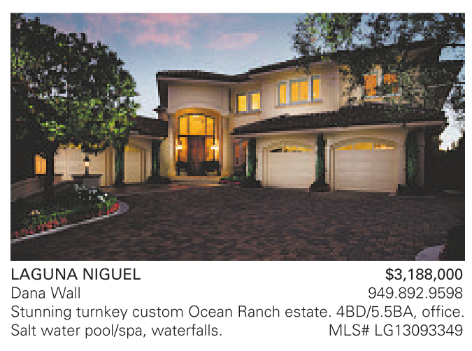 LAGUNA NIGUEL $3,188,000 Dana Wall 949.892.9598 Stunning turnkey custom Ocean Ranch estate. 4BD/5.5BA, office. Salt water pool/spa, waterfalls. MLS# LG13093349
